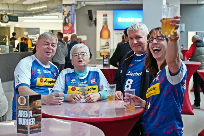 Zu unserem Glück schafften wir es gerade noch rechtzeitig zurück zum Bulli, bevor ein sintflutartiger Regenschauer einsetzte. Auf der Landstraße kurz vor Zwickau überholten wir den „HSG-Express“; die Zeit vor Spielbeginn reichte noch für Kaffee und Kuchen in einem Baumarkt-Café unweit der Stadthalle, die seit dieser Saison „Sparkassen-Arena“ heißt. In der Halle angekommen, bezogen wir unsere Plätze im Oberrang und testeten das in Zwickau gewohnt vielseitige Angebot an Speisen und Getränken: